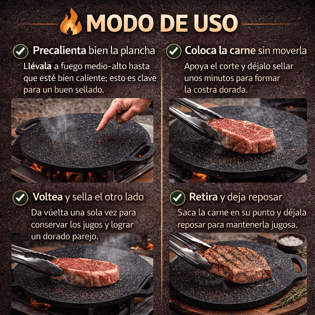 - 🔥 Coloca la plancha sobre tu cocina de gas, eléctrica, incluso leña o carbón